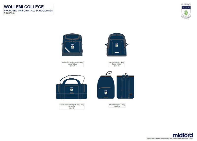 Please ensure your son has a navy-blue school bag of appropriate size for the student’s age. Backpacks are acceptable providing they are designed for school and not recreational use and do not have inappropriate logos. Midford stocks a very good quality bag for your convenience.