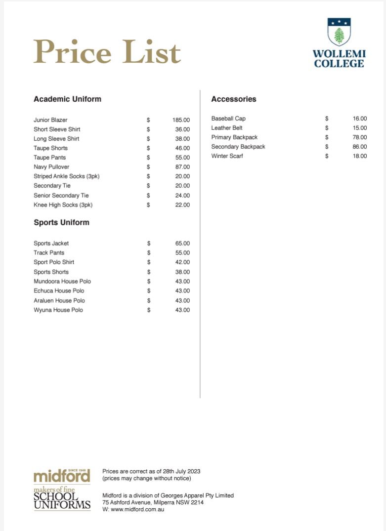 The Wollemi uniform is only available for purchase from Midford. All ordering and sales of Wollemi uniforms will occur online with orders being collected from the College or delivered to your home address. To further assist our families, free home delivery is offered for all orders of $50. This provides families with a fast and easy method of receiving their uniform orders.