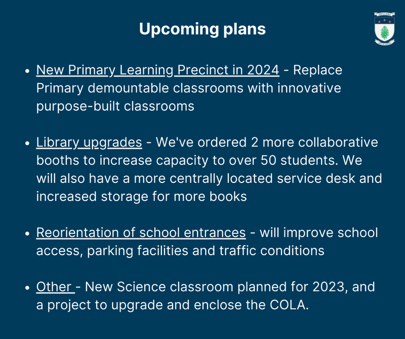 We are in the process of finalising our Master Plan. Stage 1 of the Master Plan is building the new Primary Learning Precinct. The aim is to begin construction in 2024. This will see our Primary students move from demountable classrooms into new, innovative purpose-built classrooms that foster collaboration and engaging learning. The Master plan also includes a new library, the creation of designated learning precincts, and the removal of demountable buildings to create extra sporting space.