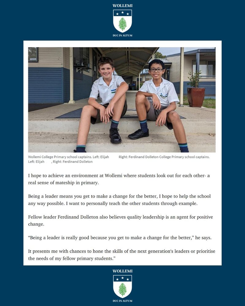 We are thrilled to announce that Wollemi College was recently featured in the Daily Telegraph! Our School Captains, Steve J and Sourav S, along with Primary captains Elijah B and Ferdinand D, were interviewed on their visions for the College this year.